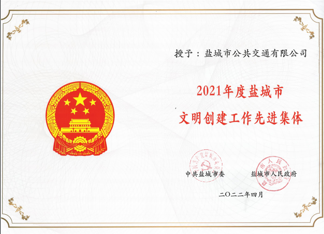 • 2022年4月公司被授予2021年度鹽城市文明創建工作先進集體榮譽稱號